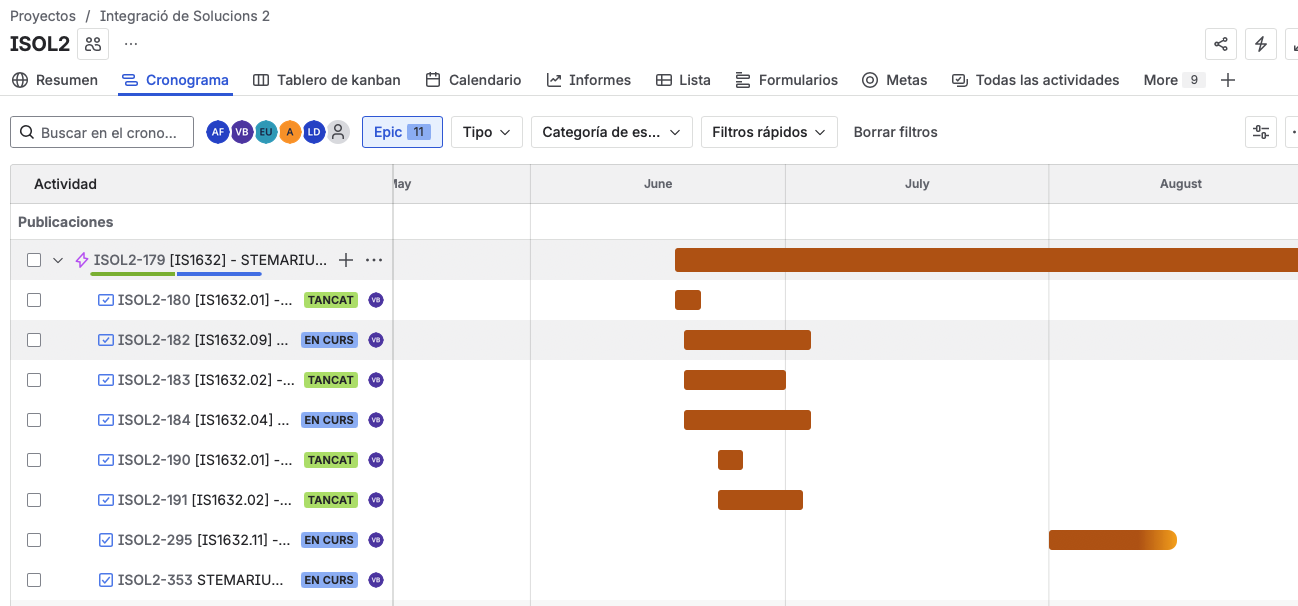 Per veure la representació temporal d’un projecte, cal clicar a Cronograma per visualitzar les tasques associades.