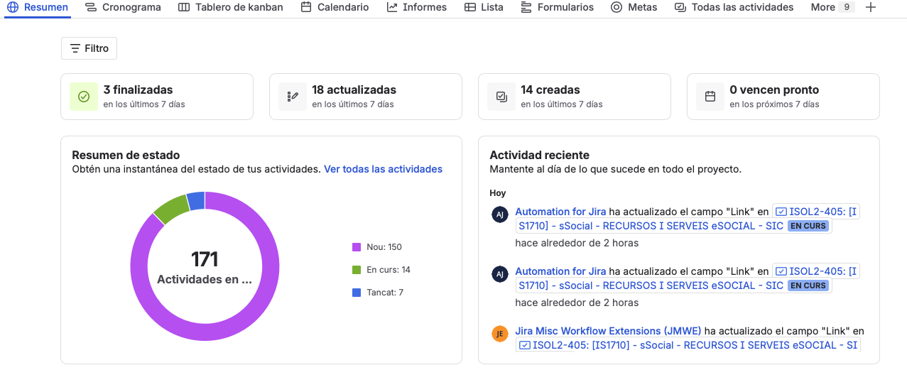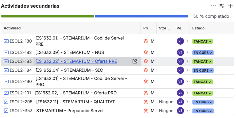 Les subtasques associades al projecte es poden consultar a la secció Activitats vinculades, on es mostren totes les tasques i el seu estat.