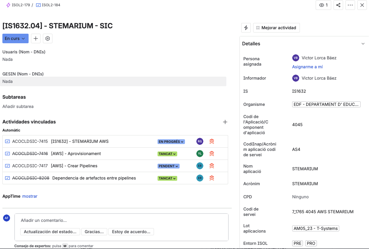 - VALIDACIÓ ISOL ➔ Un cop el LOT AM valida que l’entorn ha sigut instal·lat correctament i que tots els sistemes han sigut integrats correctament canvia l’estat a “Validació ISOL”. Aquest comprova que no hi hagi cap comentari del LOT AM.