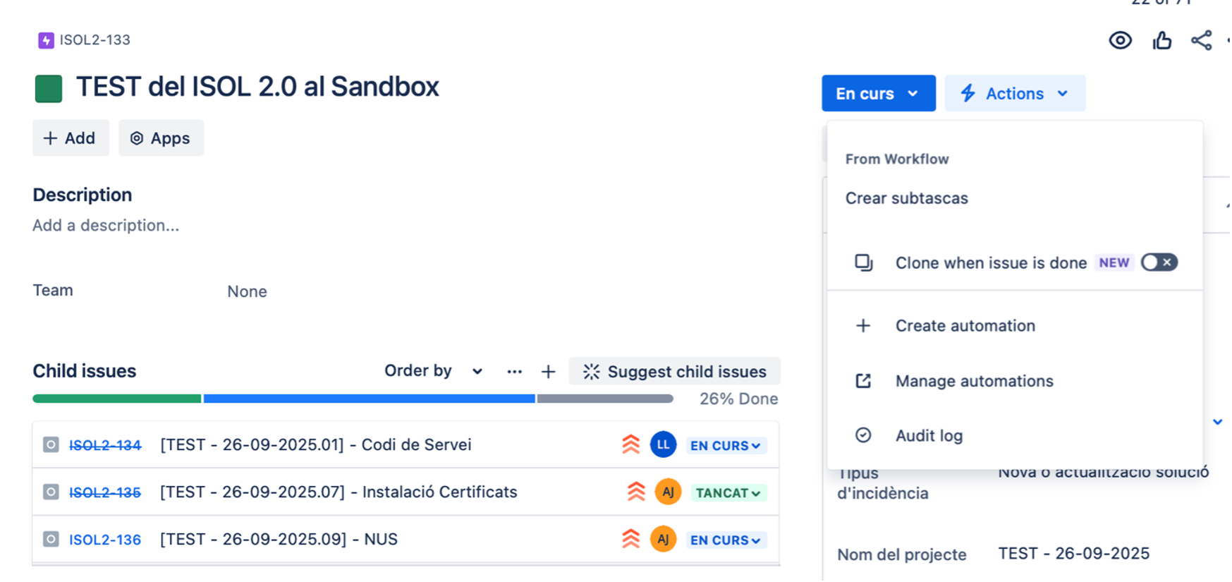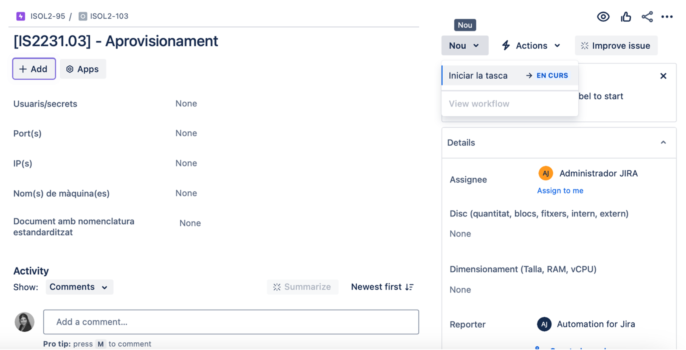 - VALIDACIÓ ISOL ➔ Un cop finalitzat l’aprovisionament, s’ha de canviar l’estat a “Validació ISOL”. Si falta documentació o és incorrecta, l’Agent ISOL ho notificarà als comentaris de Jira i tornarà a assignar la tasca a CPD perquè es corregeixin els errors.
